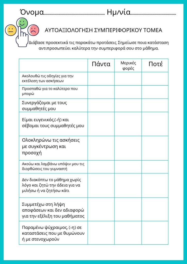 Για την αυτοαξιολόγηση της συμπεριφοράς ενδείκνυται ερωτηματολόγιο με κλίμακα διαβάθμισης ώστε τα παιδιά να μπορούν να αναλύουν περισσότερο την απάντησή τους και να προκρίνεται ο αναστοχασμός.